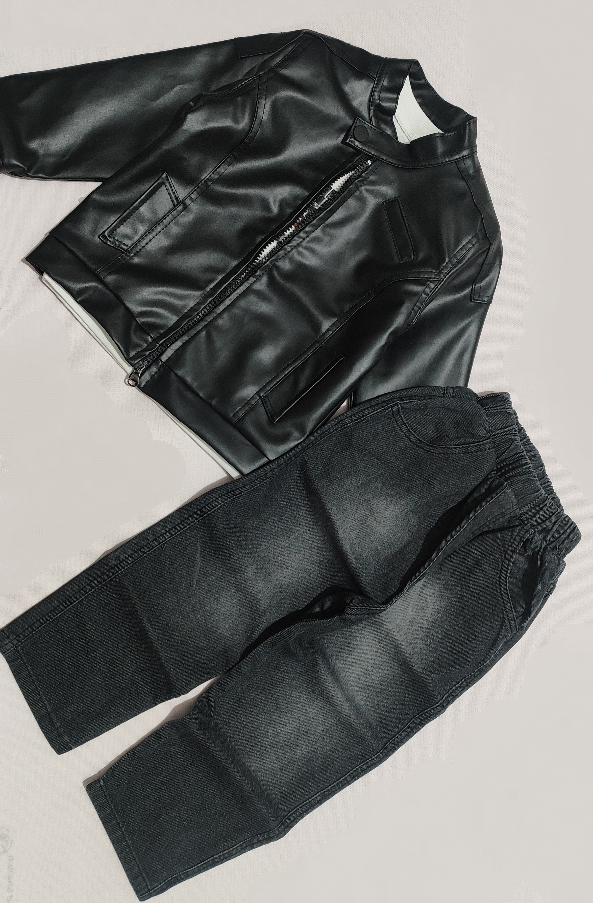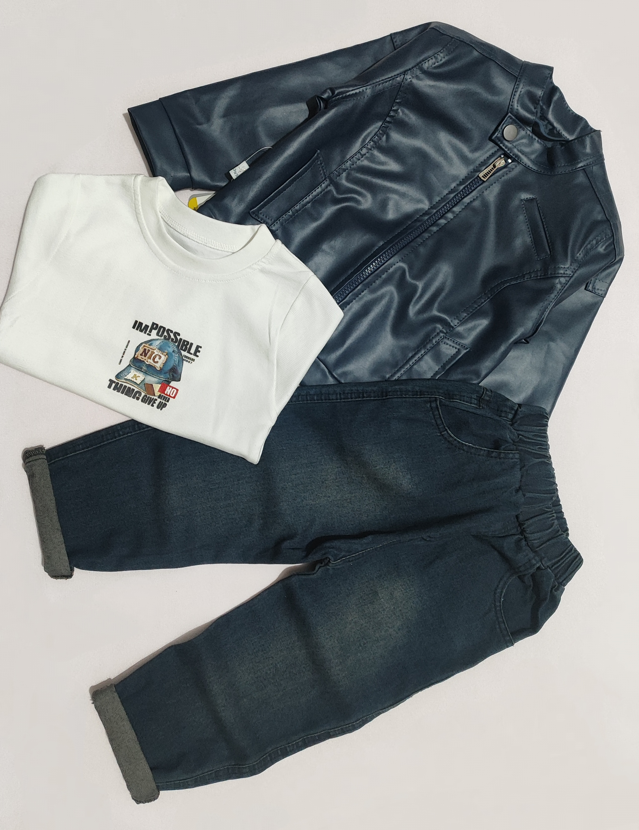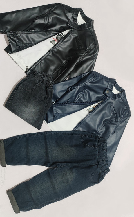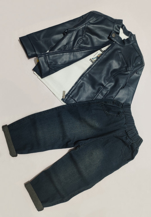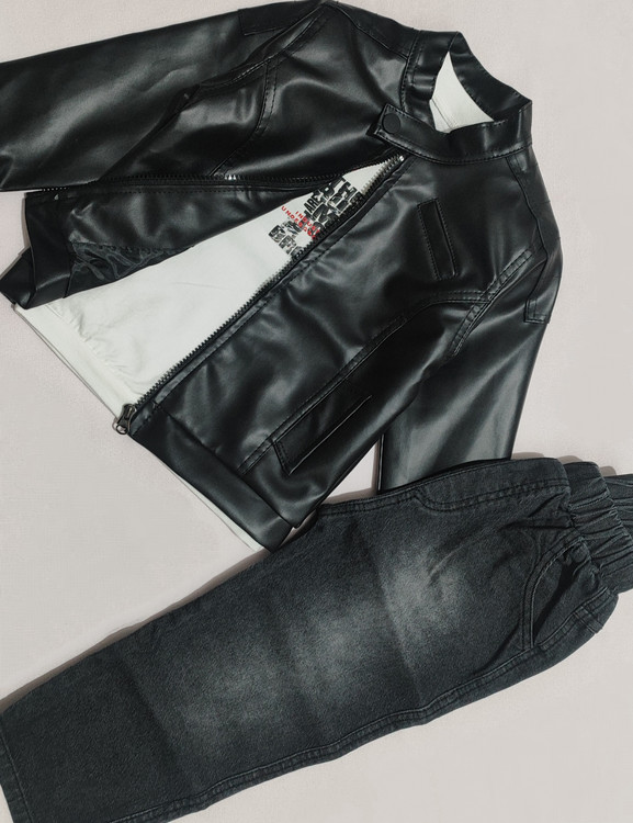 سه تکه چرم . تنخور بسیار شیک و زیبا . مناسب ۱ تا ۴ سال . شلوار لی کاغذی . کت چرم نازک مناسب عید . یک کار مجلسی بسیار باکیفیت . ضمانت تعویض و مرجوع تا ۲ روز پس از تحویل .